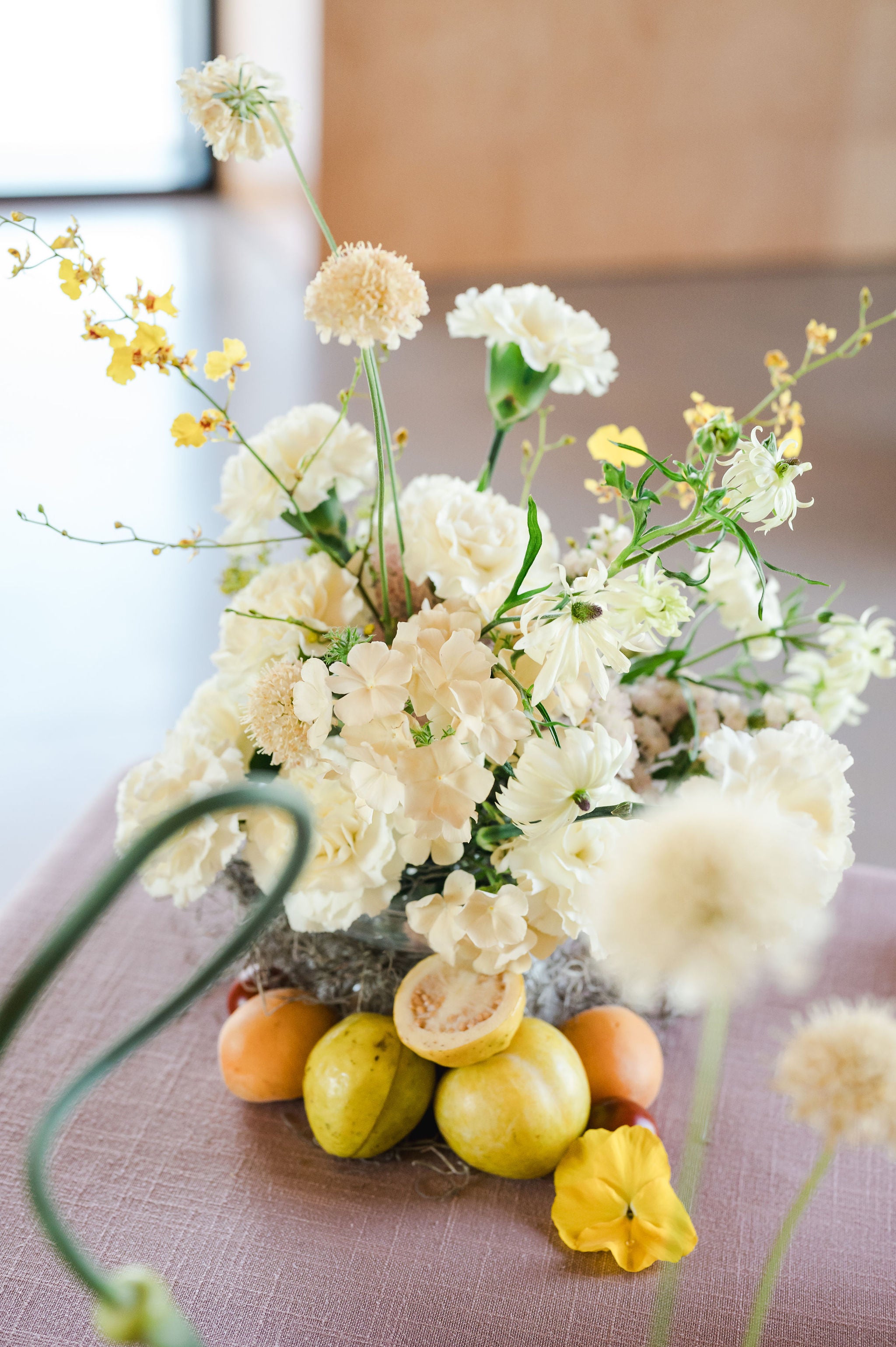 - We used non-floral styling elements like vibrant green tomatoes, guava, apricots, and beans to add a splash of colour and intrigue alongside the centrepieces on the table.